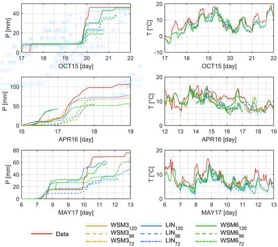 Observed and simulated precipitation (left) and temperature (right) time series for OCT15 (upper row), APR16 (central row) and MAY17 (lower row) events. Three lead times (72, 96 and 120 h) and three MP parameterizations (LIN, WSM6 and WSM3 when used) are considered. Graphical modifications to the rainfall time series are indicated in the previous paragraphs.