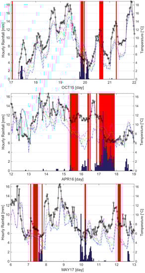 To understand the ensemble performance, we plot the observed hyetograph in the Apoquindo gauge (blue bars) and temperature series against the red region denoting the time at which more than of the WRF ensemble predict rainfall (Figure 8). In the figure, we also plotted the 25th, 50th and 75th percentiles of the temperatures simulated by the ensemble. Note that the ensemble corresponds to as all the simulations performed for each rainfall event, indistinctive from their lead time or MP scheme, i.e., 6 simulations for OCT15, 9 for APR16 and 6 for MAY17 (Table 3).