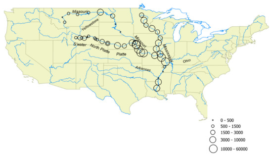 By contrast, the large jump in INP concentration in the Missouri, from 1500 to 10,000, as it crossed from Montana into North Dakota (Figure 1), was likely due to large inflows of INP-rich water from the Yellowstone River just upstream of the Williston sampling point. During the afternoon of sampling, the Missouri’s discharge was only 250 m3 s−1 (measured near Culbertson; USGS 06185500, no suspended sediments or turbidity data available) whereas the Yellowstone was three times higher (830 m3 s−1 and 155 mg L−1 suspended sediments, measured near Sidney, USGS 06329500). Interestingly, and as was also seen below the Mississippi/Ohio junction, INP concentrations then decreased as the Missouri flowed southeast through the Dakotas.