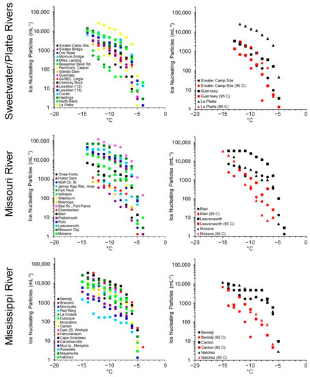 The following are available online at http://www.mdpi.com/2073-4433/9/8/307/s1, Figure S1: Full spectra of ice nucleating particle concentrations in the Sweetwater/Platte, Missouri, and Mississippi Rivers. Left column figures show INP spectra in untreated water, while the right column figures show all results for heat-treated samples (95 °C for 20 min), Figure S2: Sources of INPs in rivers.
