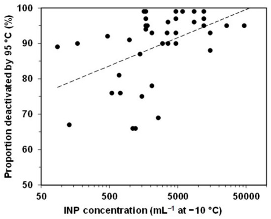 In this study, the concentrations of INPs in surface river water were much greater than that typically found in marine systems: median values at −10 °C were around 2000 times that of seawater, which tends to be ≤1 mL−1 at −10 °C [25,31] with occasionally higher transitory concentrations, probably associated with algal blooms [25]. The number of INPs was also highly variable, reflecting the relative contributions of a range of sources (Figure S2). The vast majority of INPs (66–99%, median 93%) were heat labile, suggesting a biological component. Indeed, the susceptibility of INPs to being denatured by 95 °C generally increased with their concentration in the sample (Figure 3). It can also be seen that the warmer-temperature-active INPs are more heat sensitive and that the effect is lost around −12 °C (Figure 2 and Figure S1); presumably, at colder temperatures INPs are a mix of heat-resistant organic and mineral INPs [12]. The size observations agree with previous work on freshwater INPs in Wales [31], marine INPs [17,20], precipitation [35,36,37], and recent studies showing that ice nucleating fungi and pollen release copious numbers of small (e.g., <15 nm) cell-free INPs [38,39,40].