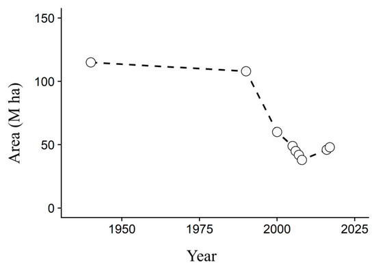 In Yakutia, the area of cultivated arable lands was 115.0 thousand ha in 1940, but this area decreased to 60.0 thousand ha by 2000 [27]. Till 2008, the area of arable lands decreased up to 38.6 thousand ha, and from 2006 there is a slight increase up to 46 thousand ha [28] (Figure 1). This trend has been observed all over Yakutia, including our study area.