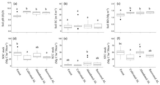 Combining SOC and SCC, soil total C (STC) was obtained. STC is significantly lower in cultivated AL than in forest and abandoned AL (p < 0.01, Figure 3). Abandoned AL show stable increases in STC depending on the age. On the other hand, lands with recovered AL show comparatively low STC (Table 2).