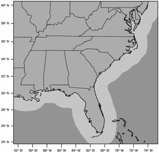 Precipitation data was obtained from the high-resolution radar-based National Mosaic and Multi-sensor Quantitative Precipitation Estimation datasets (NMQ) [44], which includes instantaneous precipitation rates over the SE U.S. from 24° N–40° N, 92° W–74° W over land to nearly 200 km offshore (Figure 1). The NMQ precipitation data was constructed from the national network of next-generation Doppler Radars (NEXRAD) and terminal Doppler weather radars (TDWR) on a 0.01° × 0.01° grid, approximately 1 km horizontal pixel spacing. The radar-derived precipitation rates were adjusted with rain gage data, and subjected to rigorous quality control [44]. The NMQ data set was used in a recent four-year climatology of mesoscale and isolated precipitation organization across the southeastern U.S. [35].