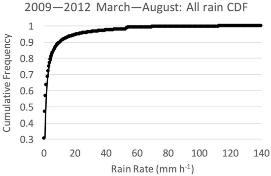 Figure 2. Cumulative frequency distribution of instantaneous rain rate ≥0.5 mm h−1 for the four-year data set of 2009–2012 from March–August.