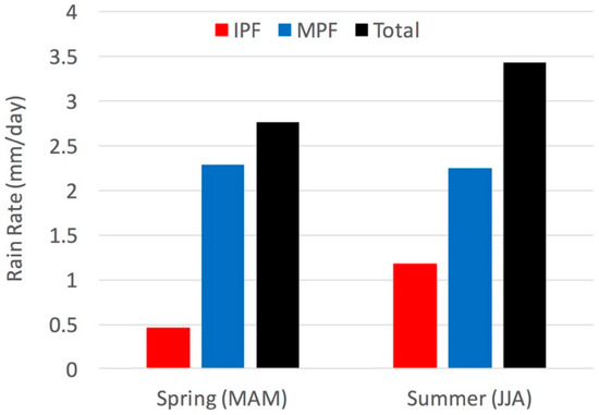 Figure 3. Mean seasonal rain rate (mm day−1) during March–April–May (spring) and June–July–August (summer) over the period 2009–2012 for isolated precipitation features (IPF) (shown in red), mesoscale precipitation features (MPF) (in blue) and total (in black).