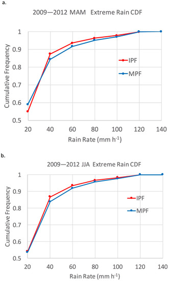 Figure 4. Cumulative frequency distribution of instantaneous extreme rain rates (≥20 mm h−1) sampled once per hour over all pixels for the period 2009–2012 in (a) March–April–May (spring) and (b) June–July–August (summer). IPF rain is shown in red and MPF rain in blue.