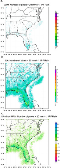 Figure 7. The number of occurrences at each pixel of instantaneous IPF rain rate >20 mm h−1 sampled once every hour over 2009–2012 for (a) March–April–May (MAM, spring), (b) June–July–August (JJA, summer), and (c), the summer minus spring difference (JJA–MAM).