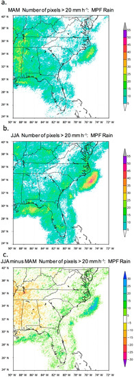 Figure 8. The number of occurrences at each pixel of instantaneous MPF rain rate >20 mm h−1 sampled once every hour over 2009–2012 for (a) March–April–May (MAM, spring), (b) June–July–August (JJA, summer), and (c), the summer minus spring difference (JJA–MAM).