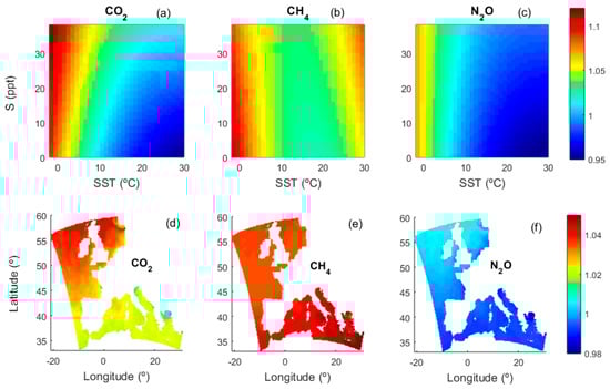 Match–mismatch between estimated solubilities of greenhouse gases. Colour scale is quotient between kH estimated from Johnson [] and from Sarmiento and Gruber []. Solubilities tested for the range of values observable at the Earth’s surface (a–c) and at the European coastal ocean from the 24 May 2014 at 06 h to the 27 May 2014 at 00 h (d–f) with each pixel corresponding to a square sided 11 km and averaged over the 66 h survey period.