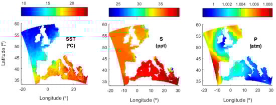 Sea surface temperature (SST), salinity (S) and air pressure (P) at the European coastal ocean from the 24 May 2014 at 06 h to the 27 May 2014 at 00 h. Each pixel corresponds to a square sided 11 km and averaged over the 66 h survey period.