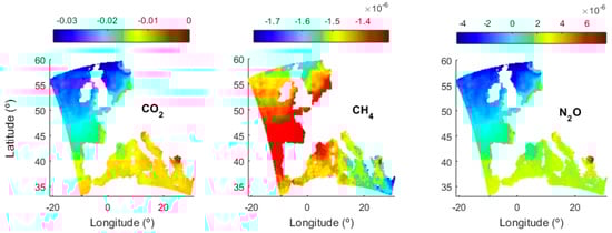 The solubility formulae were compared for the range of environmental conditions commonly found in nature: water temperature (Tw) ranged from −2 °C to 30 °C at 1 °C intervals and a salinity (S) ranged from 0 ppt to 38 ppt at 1 ppt intervals. In general, both formulations estimated similar solubilities despite their distinct chemistry backgrounds, as demonstrated by their ratio kH[20]/kH[2] close to 1 (Figure 1a–c). Nevertheless, differences from 10% to −5% for CO2, 11% to 5% for CH4, and 7% to −5% for N2O were observed in freshwaters. Determining which formulation provides more accurate estimates of greenhouse gas (GHG) solubilities in freshwater is fundamental for Earth System Modelling, because rivers and freshwater reservoirs are important sources of GHG to the atmosphere, even if only seasonably [,,,,,,,,]. In marine waters, our simulations found differences of up to 12% for CO2, 9% for CH4 and 7% for N2O, suggesting that for marine waters is also important to determine which formulation provides more accurate estimates of GHG solubilities. Afterwards, both formulae were applied to the conditions observed at the European coastal ocean during the experiment (the Level 4 SST, S and P). The surface water temperature changed significantly and there were large fresh water inflows from the Black Sea and the Baltic Sea (Figure 2 and Supplementary Video S1). Solubility estimates were averaged over a 66 h time interval and compared at each location by their ratio (Figure 1d–f). Higher divergences reached +4.5% for CO2 solubility in cooler marine waters, +5.65% for CH4 solubility in warmer saltier waters, and −2.1% for N2O solubility in brackish waters. Hence, the algorithms diverge by as much as 0.045 mol∙mol−1 of CO2, 0.0015 mol∙mol−1 of CH4 and 0.012 mol∙mol−1 of N2O (i.e., mol of gas in the ocean surface per mol of gas in the atmosphere) in some of the most sensitive situations for Earth System Modelling and satellite data processing, namely: (i) the cooler marine sub-polar waters where the solubility pump traps greenhouse gases and carries them to the deep ocean [], and (ii) the warmer waters at the coastal ocean and seas, which have regularly been observed having greenhouse gases and DMS dissolved in concentrations highly unbalanced with those of the atmosphere [,,,,,,,,,,,,,,].
