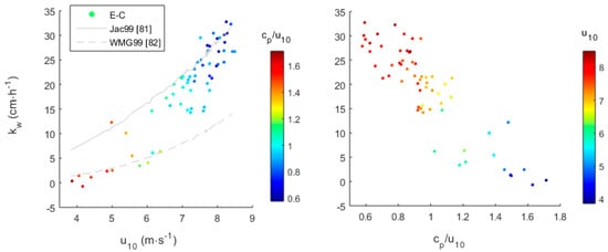 The transfer velocity (kw) scaled with u10 (r = 0.91) and with the inverse of the wave age (r = −0.88) i.e., the younger the waves, the larger the kw (Figure 4). This fits the general theory that under low–moderate wind speeds, the kw is set by surface renewal and micro-scale wave breaking (i.e., by kwind), increasing with steeper younger waves [,,], and only under higher wind speeds is kw set by bubbles from breaking waves (i.e., kbubble) [,,,,,,,,,]. The preponderance of surface renewal and micro-scale wave breaking at the coastal ocean turn it more susceptible to additional factors driving kw. As an example, under the low–moderate wind speeds often verified at the coastal ocean, the hydration reaction enhances kw [] and surfactants attenuate surface renewal [,,,,].