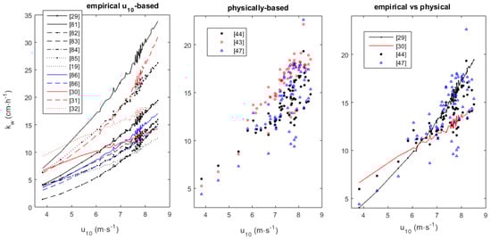 The simpler transfer velocity formulations rely on the wind velocity 10 m above the sea surface (u10) under atmospherically neutral conditions. Among then, the formulation by Wanninkhof [] (henceforth also referred to as ‘Wan92’) became the standard used in ESM and satellite data processing (Equation (9a,b)). It includes the Schmidt number of the water (Scw), related to viscosity, raised to an exponent sensitive to the assumed model of surface renewal. For sparingly soluble gases or for CO2 in alkaline waters, and under low winds, the transfer velocity is enhanced by the hydration reaction (bT), which is sensitive to temperature.