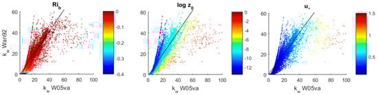 Comparing the formulation by Wanninkhof [] (Wan92) to the formulation by Woolf [] (W05va) using modelled data about the European coastal ocean. Differences in the estimates of transfer velocity (kw) as functions of the bulk Richardson number (Rib), roughness length (z0) and friction velocity (u*). The 1:1 line (in black) represent equal kw estimates.