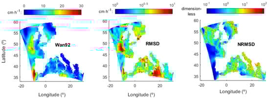 In some rare situations the algorithms estimated unreasonably high kw despite the z0 bounds imposed in the software. To avoid this bias, a 200 cm∙h−1 ceiling was imposed on all kw estimates. The higher transfer velocities were associated to storms, both on the Atlantic side and on the Mediterranean side (Figure 7 and Supplementary Video S5). The root mean square deviation (RMSD) was estimated between the empirical u10-based Wan92 formula and the physically based W05va formula, averaged over time for each location. Results showed that both formulations diverged the most, in absolute terms, under storms and under strong winds near shore (Figure 7). On the other hand, the normalized root mean square deviation (NRMSD)—i.e., the deviation standardized to the Wan92 prediction—showed that, in relative terms, these formulations diverged the most under low and moderate winds and sea states near shore (Figure 7). The physically-based W05va formulation was also used to compare between the kwind and kbubble components of the CO2 transfer velocity. The kbubble term was always lower than the kwind term, and at best 90% of kwind in the fetch-unlimited Atlantic or in the Mediterranean storms (Supplementary Video S5). Over the full domain, the kbubble term was on average 12% and on median 15.9% of the kwind term. Whatever the greenhouse gas, the differences were negligible between estimating kw using the single-layer or the double-layer schemes (Supplementary Video S5). Nevertheless, it is worth noting that the bigger differences were found under Mediterranean storm conditions.