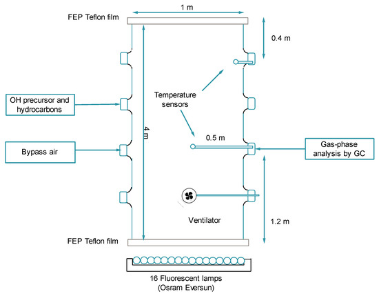 The simulation chamber is located at the Atmospheric Chemistry Research Laboratory of the University of Bayreuth in a temperature controllable room, where the temperature could be set from 298 K to 248 K with the aid of an inside cooling system in the room and monitored by a thermistor Epcos NTC 50 K, calibrated against a platinum resistance thermometer (Keithley 195A with probe 8693) from −40 °C to +30 °C. The chamber consists of four cylinder sections made of glass (Duran, Schott, inner diameter 1 m, total height 4 m), yielding a volume of 3.2 m3. Sixteen fluorescent lamps (Osram Eversun, 80 W each, kept at 300 K by an air thermostat) were employed as light sources, irradiating the chamber from the bottom through Teflon film (FEP 200A). The emission spectrum of the lamps has a Gaussian shape with a maximum at 350 nm, it starts at 300 nm and extends beyond 450 nm, containing the emission lines of mercury. The inherent heating effects on the bottom caused by the lamps led to a vertical temperature gradient, enhancing the mixing efficiency. Sensors in the middle and upper part of the chamber measured the temperature and a ventilator was installed in the middle of the chamber to accelerate further mixing. The temperature regulation leads to variations of ±1 K in the refrigerated laboratory. A schematic diagram of the simulation chamber is shown below (Figure 1).