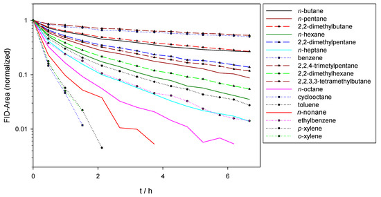 where [HC] and [OH] represent the concentration of hydrocarbon and OH radicals at time t, respectively, is reaction rate constant of target hydrocarbon with OH and kdil includes other changes that cause the decrease of the hydrocarbons (e.g., dilution, wall adsorption). By using n-perfluorohexane (PFH) as an internal standard, we corrected the hydrocarbon data for the dilution of the chamber contents by the gas consumption of the gas analyzers for ozone and NOx, eliminating the second term from Equation (3). Integration then leads to the simple equation