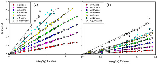 Plot of ln(c0/ct) of straight-chain alkanes and cyclooctane versus toluene (reference substance). (a) Data points of three experimental runs at 288 K; (b) Data points of two experimental runs at 248 K. The curvature of the data and the non-zero intercept for n-nonane at 248 K indicate experimental limitations of adsorption in the sampling capillary of the gas chromatograph. The symbols ▽, ○ and □ distinguish data points from different experimental runs, plots of branched-chain alkanes and aromatic hydrocarbons are displayed in the SI.