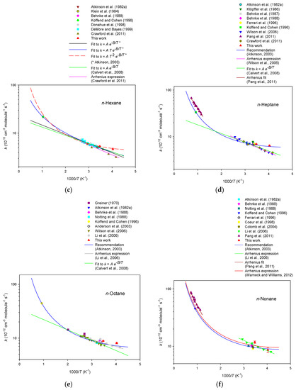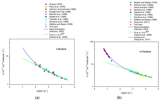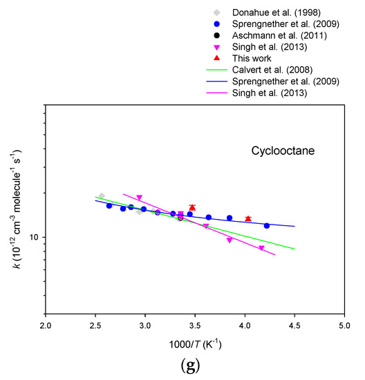 In order to compare to previous evaluations, the regression lines from the Arrhenius expressions for each hydrocarbon are displayed in the figures. Detailed explanations and illustrations for the alkanes and cycloalkanes can be found in the review article by Atkinson [27]. Our results demonstrate that the rate constants obtained in the present study generally agree well with the literature data, which prove that the experimental method is reliable. Moreover, the experimental results complement existing gas-phase kinetic data for hydrocarbons in the following points: