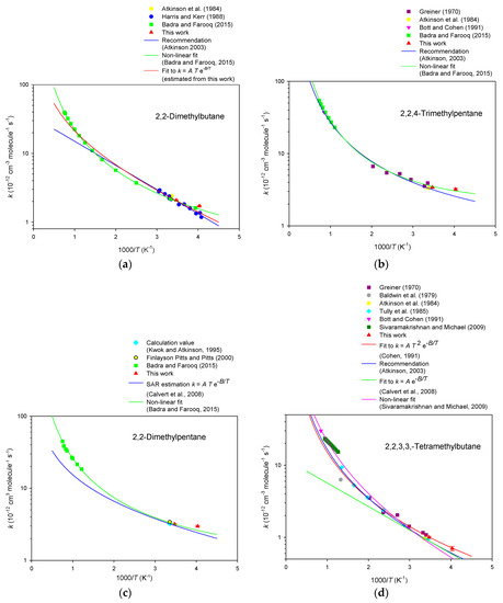 Arrhenius plots of the rate data for the reaction of OH radicals with branched-chain alkanes [47,53,54,55,56,57,58].