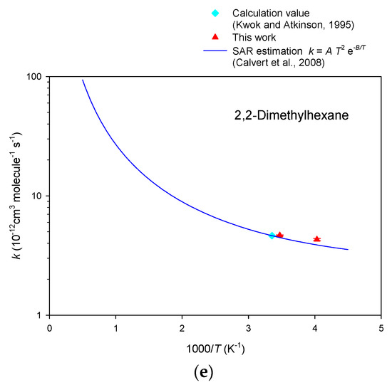 (2) Figure 5 shows the Arrhenius plot for the reaction of branched-chain alkanes with OH radicals. For the first time, we report the rate constant below 290 K for the reactions of OH radicals with 2,2,4-trimethylpentane, 2,2-dimethylpentane, 2,2,3,3-tetramethylbutane and 2,2-dimethylhexane. The reaction rate constant data for 2,2-dimethylbutane, 2,2,4-trimethylpentane and 2,2,3,3-tetramethylbutane are consistent with previous results and follow the existing Arrhenius expressions (or non-linear fit) as well. For 2,2-dimethylbutane, we give an estimated Arrhenius fit to k = ATe−B/T by applying the value of activation energy (B = 445 K) estimated by Kwok and Atkinson [50] and obtain an expression of k = 3.33 × 10−14 T e−445/T cm3 molecule−1 s−1. For 2,2-dimethylpentane and 2,2-dimethylhexane, calculated values (based on a structure-activity relationship (SAR) [51]) at room temperature are given for these two compounds to evaluate the temperature dependence. The results of 2,2-dimethylpentane fit well to the non-linear fit provided by Badra and Farooq [52]. A SAR estimation is given for 2,2-dimethylhexane, and our data fall very close to the estimation line. Nevertheless, in order to give a more accurate evaluation of the temperature dependence of 2,2-dimethylhexane, more experimental data are needed to establish the temperature dependence and hereafter to develop the Arrhenius expression for this compound.