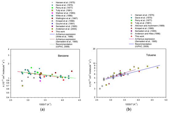 Arrhenius plots of the rate data for the reaction of OH radicals with aromatic hydrocarbons [33,34,59,60,61,62,63,64,65,66,67].