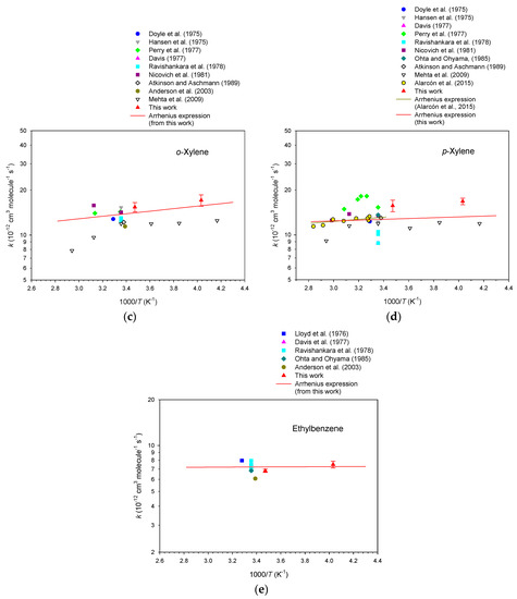 (3) Regarding the activated aromatic hydrocarbons, our rate data points at 288 K and 248 K coincide well with the existing data points, showing that the rate constant for these reactions had a negative dependence on temperature at T ≤ 298 K, which indicates a coherent pathway of electrophilic addition of the OH radical to the aromatic ring [23]. Combining our results with the available literature data (Figure 5), we here give Arrhenius expressions for o-xylene, p-xylene and ethylbenzene: 6.24 × 10−12 e(203 ± 126)/T cm3 molecule−1 s−1, 1.03 × 10−11 e(62 ± 116)/T cm3 molecule−1 s−1 and 6.90 × 10−12 e(8 ± 135)/T cm3 molecule−1 s−1, respectively (SI, Table S3). All previously reported data points for ethylbenzene existed around room temperature, which caused great uncertainties in determining the activation energy. Further investigations at other temperatures lower than 298 K are required to give a more precise evaluation of the Arrhenius expression for ethylbenzene.