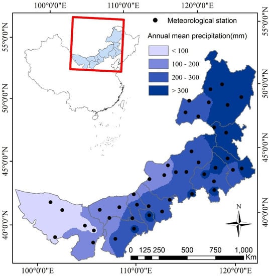 Inner Mongolian Plateau (IMP) is home to many dairy and beef cattle farms, cash crops such as soybeans and corn. The predominance of these economic activities is reliant on the regional natural resources, which result in IMP being vulnerable to climate change, especially to climate extremes. Grassland accounts for approximately 67% of the total land area in IMP [,]. Therefore, grassland plays an important role in the development of animal husbandry, which is an important part of agriculture. Various ecological construction programs were implemented in IMP, but grassland is still exposed to natural disasters, for example, precipitation extremes. Farm systems have evolved to cope with modest variations in climatic conditions but are susceptible to climate extremes. This is partly due to the fact that changes of precipitation extremes show much more distinctive regional characteristics, compared to temperature extremes []. Previous research also confirms that grassland is the most sensitive ecosystem for precipitation fluctuation []. Precipitation extremes can not only directly affect the grassland ecosystem by affecting the supply of soil moisture, but can also affect the supply of soil nutrients indirectly []. Apart from this, extreme precipitation events also have a profound impact on the growth and physiology of grassland plants. Grassland plants have evolved their own adaptation strategies for arid and semi-arid environmental fluctuations. They can improve their water-efficiency by changing their own form and physiological functions to adapt to different water conditions and improve their own competitiveness and ecological adaptability at the same time []. However, due to global warming, changes in precipitation extremes show high-frequency, high-intensity, and long-lasting trends, which often have a serious impact on vegetation. For example, extreme precipitation events can cause plant damage or death by wilting []. This will indirectly but seriously affect the animal husbandry and agriculture, since grassland provides the food for livestock, and the livelihoods for pastoralists. The Intergovernmental Science-Policy Platform on Biodiversity and Ecosystem Services (IPBES) reported that extreme weather events are one of the main causal factors leading to land degradation [], which directly leads to a drop in potential agricultural productivity and gives rise to concerns about food security; grassland is no exception. Livestock products are one of the sole sources of income for pastoral families and many herders far exceeded their maximum allowable quantity for livestock [], which causes a huge burden on grassland, exceeding its carrying capacity and leading to grassland degradation. The expansion of agriculture into grassland regions which are ecologically unsuitable for farming is another land degradation factor []. This exacerbates the effects of climate extremes. In some dry or semi-dry regions, the precipitation extremes associated with climate change are pushing the coping capacity to its limits. People in this region have normally focused their attention on temperature-related issues. Therefore, understanding the changing patterns of extreme precipitation events and their causal factors may offer a basis for understanding the responses required of grassland ecosystems to extreme precipitation events, and for the development of agriculture in IMP. There is some limited research about climate extremes in IMP. Yan et al. [], for instance, found that extreme precipitation events showed a decreasing trend with a low frequency and intensity in Inner Mongolian during the past 50 years. You et al. [,] believed that the amount of rainfall associated with extreme precipitation events decreased in the middle and southeast of Inner Mongolia, but increased in the northeast and west over a recent 48-year period, after the abrupt temperature increase in 1987. Liu [] studied the spatial-temporal changes of extreme climate events during 1970–2012, and the results showed that Max Tmax (TXx) and Min Tmin (TNn) displayed asymmetric changes. TXx has a non-significant positive trend in the forest and steppe of the Hulun Buir region; while the TNn had a significant positive trend before 21th century and then displayed volatile variability. Frost days and ice days were shown to be decreasing, while tropical days and summer days showed an increasing trend. Extreme rainfall trends were generally less spatially coherent across the region and precipitation, the Simple daily intensity index (SDII) and number of very heavy precipitation days (R20) showed a decreasing trend in forest and steppe, and an increasing trend in the desert region.