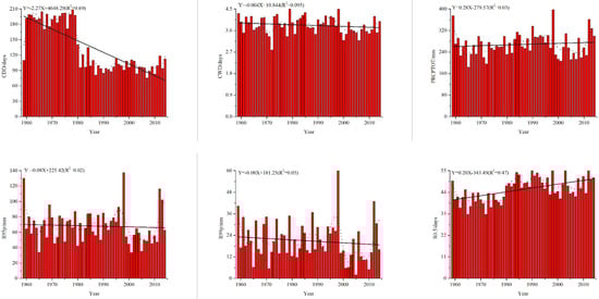 To analyze the temporal variations of precipitation extremes in the IMP, the average values of the IMP are firstly computed. Figure 2 illustrates the time series of several precipitation indices in IMP during the period 1959–2014. Almost all extreme precipitation indices, except number of precipitation days with over 0.5 mm (R0.5) and number of heavy precipitation days (R10) and total precipitation in wet days (PRCPTOT), showed decreasing trends over the IMP during the period 1959–2014. Changes about CDD (−22.7 days/decade) and R0.5 (2 days/decade) are pronounced significant (p < 0.05) over time, and the other nine indices displayed non-significant. These results indicate that the duration of precipitation extremes in IMP seemed to decrease, while the frequency of precipitation events have increased, particular the R0.5. The eleven extreme indices can not only express the intensity, frequency, and magnitude of extreme precipitation, but also indicate the dryness and wetness. A previous study illustrated that changes in the CDD were in accordance with the projections for the increase in dryness in the Mediterranean area and central Europe []. This also indicates that CDD can represent dryness. Among the eleven indices, except CDD as a dry index, the other ten extreme precipitation indices in this research are wetness indices.
