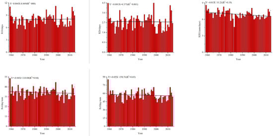 The low-pass filter, introduced by Sedra et al. [], was applied to the annual anomaly series relative to 1959–2014 mean values for all precipitation indices to highlight the decadal or longer time-scale variations and trends. Then the simple linear regression method is utilized to analyze the trends of 11 precipitation indices among the 43 meteorological stations. The Mann–Kendall (MK) test was used to evaluate the statistical significance of the trends, and the abrupt analysis [].