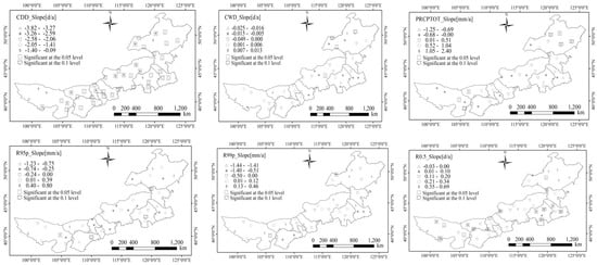 Based on the above results, the general variation tendency for wet indices over the IMP during 1959–2014 is decreasing; the dry index also shows a decreasing trend, but with larger magnitude, which can indicate that the dry situation was alleviated in the IMP during the study interval. While comparing with the northwest area of China, CDD in IMP showed a greater decreasing trend [], which makes this research even more interesting. The use of averages over the spatial region means that a lot of regional specific information would be lost. To solve this problem, this paper also analyzed precipitation extremes based on data from meteorological stations.