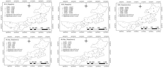 To analyze the spatial variations of precipitation extremes in the IMP, precipitation indices in each station were computed. Regarding the spatial distribution (Figure 3), CDD, 100% of the stations showed a decrease over time; 90.7% of these stations passed the significance test at the 0.1 level. CWD at 67.4% of the stations showed a decrease, but only 13.8% of these stations exhibited significant trends (p < 0.1). Negative slopes dominated the spatial distribution maps, although scattered positive trends were found among those that appeared as a cluster in the middle and western area of IMP. Stations where PRCPTOT increased and decreased accounted for 65.1% and 34.9% of the total, respectively, but only 18.6% of these stations exhibited significant trends (p < 0.1). The stations with PRCPTOT increase were mainly located in the north-eastern area. SDII at 81.4% of the stations showed a decrease, 42.9% of these stations passed the significance test at the 0.1 level. The variations at the stations had significant characteristics of spatial aggregation and were evenly distributed in the northeast of the IMP. R10 at 62.8% of the stations increased and 14.8% significant at 0.1 level, while R20 at 51.2% of the stations deceased, but only about 9.1% of these stations exhibited significant trends at the 0.1 level. Rx1day at nearly 55.8% of the stations showed a decrease, but approximately 12.5% of these stations exhibited significant trends at the 0.1 level.