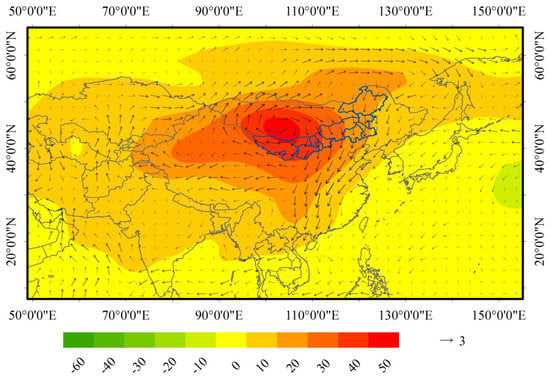 As one of the most important parts of the arid area in the northwest and the eastern margin of the arid area, the IMP is strongly influenced by the western-wind system and is also affected by the monsoon []. Previous research analysis found that the East Asian monsoon influences the spatial variation of extreme precipitation events []. Additionally, as the rainfall in IMP is mainly concentrated in the summer, this paper mainly discusses summer monsoons by creating atmospheric circulation composites in summer. Details can be found in Figure 4. The MK test based on the CDD during 1959–2014 and found 1983 as the abrupt year (p < 0.05), thus, these two periods represents the changed atmospheric circulation. The mean difference (new minus old) of wind vectors and geopotential height at 850 hPa between 1959–1982 (abrupt-before) and 1983–2014 (abrupt-after) in summer has been shown in Figure 4. From the view of geopotential height composite, there is an enhanced anticyclonic circulation developing over the Eurasian continent, and the Mongolian Plateau is the area with the largest differences. This result may prevent northward propagation of water vapor flux from the ocean, which can lead to decrease trends of precipitation extremes in IMP. At the view of wind vectors composite, it is crystal clear that northeasterly wind is enhanced during 1983–2014 as compared to 1959–1982, which indicates there is a weaker East Asian summer monsoon, and this can weaken the northward extension of the summer monsoon. Previous research has shown similar results [,,]. The above analysis shows that most extreme precipitation indices in IMP has shown decreasing trends.