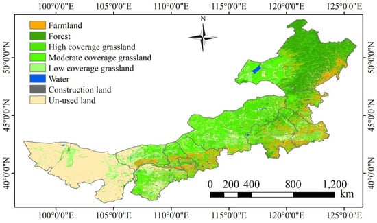 The Inner Mongolian Plateau (IMP) (Figure 1) is a vast area of grassland, ranking at the top of China’s five pastoral areas, and it is one of the most sensitive areas to global warming. The average warming rate in the whole region has reached 0.36 °C/decade since 1961, which is significantly higher than the national warming rate over the same period. The major crop yields were affected by climate fluctuations, changing phenology times, the risk of forest fires has increased, the total water resources have decreased, and the water deficit has become quite severe. The adverse impact of future climate change on economic and social development and ecological and environmental security will be further increased []. Grassland in Inner Mongolian Plateau is particularly important, not only acting as feed sources for livestock and as habitats for wildlife, but also by contributing to the livelihoods of local people. As reported, animal husbandry in IMP accounted for 45% of the province’s gross output value of agriculture in 2013 []. Grassland in IMP is faced with the same problems as worldwide grassland: widespread degradation due to limited resilience to climate extremes (such as droughts), rapid increases in demand for livestock products, and the high level of poverty among pastoralists [].