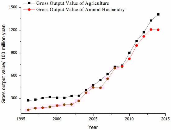 Gross output value of agriculture and animal husbandry in the IMP from 1996 to 2014.