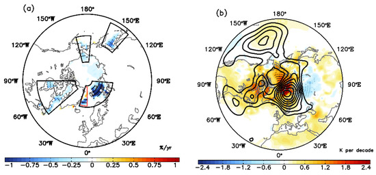 (a) Linear trend distribution of the Arctic sea ice cover (SIC) for winters (DJF) from 1979–2016. Four key sea regions (black boxes) are Baffin Bay, Barents-Kara Seas, Okhotsk Sea and Bering Sea. The small region in red box is Greenland Sea. (b) Regression pattern of the detrended winter 500-hPa geopotential height (contours) and surface atmosphere temperature (SAT: shading) anomaly against the detrended DJF mean SIC anomaly across the whole Arctic during 1979–2016. The dotted areas represent values that are above the 95% confidence level based on a two-sided Student’s t test.