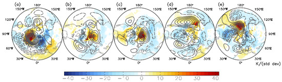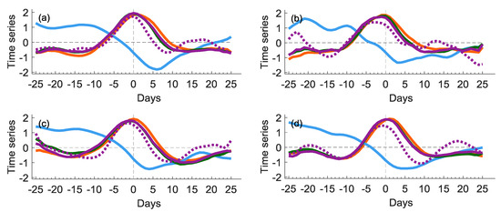 In this study, the lag 0 day is defined as the day with maximum amplitude for a blocking event, while the lag −n (lag n) day means the nth day before (after) the lag 0 day; this notation has been applied in previous studies [21,27]. The composite analysis used in this study is based on the life cycle of each blocking event. To capture the main processes and features of each blocking event, composite analysis should be carried out according to a primary criterion (lag 0). For a single blocking event, the day with the maximum amplitude (lag 0) is usually accompanied by dramatic changes such as temperature and meridional wind anomalies. Therefore, our composite analysis is applied by using the lag 0 day as the benchmark for each individual event, which can show the common characteristics of the evolution of the blocking life cycle and highlight the characteristics of the peak period during the blocking life cycle.