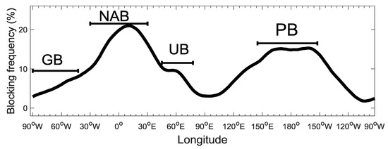 Percentage frequency of blocking as a function of longitude for winters from 1979–2016. GB, NAB, UB and PB represent Greenland blocking, North Atlantic blocking, Ural blocking and Pacific blocking, respectively.