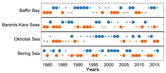 Since the regional blocking circulation in the Northern Hemisphere has a close link with the Arctic SIC changes in local areas, it is necessary to examine the blocking frequency distribution along entire latitudes by using the TM index as noted in Section 2. As shown in Figure 3, the blocking frequency exhibits three peaks over the North Atlantic, the Ural Mountains and the Pacific region, corresponding to North Atlantic blocking (NAB) (Figure 2a), UB (Figure 2b,c) and PB (Figure 2d,e), respectively. However, the Greenland blocking (Figure 2a) is not found to show a very high (a significant peak) frequency near 60° W in Figure 3. The NAB pattern cannot be observed according to the regression patterns in Figure 2, although the frequency of NAB is the highest (Figure 3). This result means that not only the frequency of blocking but also the location of blocking and other factors may affect the variations in sea ice. To further verify the linkage between SIC and blocking frequency, the winters with higher and lower SIC in each key region are selected by averaging the SIC within each key region (Baffin Bay, Barents-Kara Seas, Okhotsk Sea and Bering Sea). In order to remove the effects of long-term climate trends, the linear trends of all the SIC time series are removed. As shown in Figure 4, the larger (smaller) blue circles indicate winters with SIC greater than 0.5 (0) standard deviation, while the larger (smaller) orange circles indicate winter with SIC less than −0.5 (0) standard deviation. Figure 4 illustrates that the higher (lower) SIC winters vary from region to region (Baffin Bay, Barents-Kara Seas, Okhotsk Sea and Bering Sea). However, the decadal variations in regions Barents-Kara Seas, Okhotsk Sea and Bering Sea are similar, with more low-SIC winters during 1979–1995 and 2005–2016 and more high-SIC winters during 1996–2005 (Figure 4).