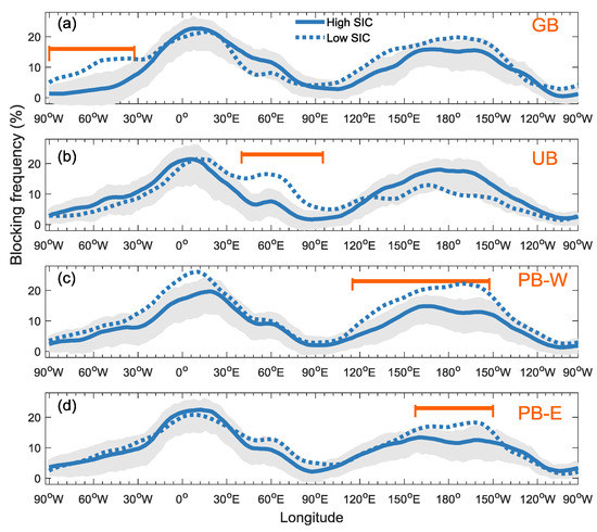 According to the high SIC winters and low SIC winters in each key region (Figure 4), the composites of the blocking frequency over the Northern Hemisphere are shown in Figure 5. In Figure 5a, the solid (dotted) line represents the composite of the blocking frequency for high (low) SIC winters for region Baffin Bay. Similarly, Figure 5b–d represent the composites for regions Barents-Kara Seas, Okhotsk Sea and Bering Sea. Figure 5a shows that the difference in the blocking frequency between high and low SIC winters for region Baffin Bay from 90° W to 30° W (orange line tagging) is significant (above the 95% confidence level based on a Monte Carlo test). The blocking that occurs from 90° W to 30° W is GB, as shown in Figure 2a. In addition, for region Barents-Kara Seas (Figure 5b), the difference in the blocking frequency between high and low SIC winters from 30° E to 90° E (orange line tagging) is clear (above the 95% confidence level based on a Monte Carlo test), which may correspond to UB, as shown in Figure 2b. For regions Okhotsk Sea (Figure 5c) and Bering Sea (Figure 5d), the difference in the blocking frequency over the Pacific (120° E to 150° W for region Okhotsk Sea and 150° E to 150° W for region Bering Sea) between high and low SIC winters is evident. In addition, the area with significant difference in Figure 5c is wider than that in Figure 5d. This result is consistent with the pattern shown in Figure 2d,e, where the PB pattern in Figure 2d is wider than in Figure 2e. Since the positive center in Figure 2d is more westerly than that in Figure 2e, the PB in Figure 2d and Figure 5c (Figure 2e and Figure 5d) is called the western (eastern) PB or PB-W for short (PB-E). Moreover, it should be pointed out that in each SIC region, the difference in the blocking frequency may occur outside the corresponding region. For example, in Figure 5b, the difference in blocking frequency occurs not only in region Barents-Kara Seas but also in the Pacific region. This difference occurs because for a winter, there may be anomalous SIC in more than one region, which makes the winters of anomalous SIC overlap in each region. However, our results do show that there is a close relationship between the blocking circulation in each region and the changes in the local SIC.