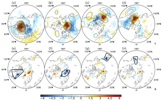Composite of the blocking events from lag −2 to lag 2 for (a,e) GB, (b,f) UB, (c,g) PB-W and (d,h) PB-E. (a–d) represent the composites of the 500-hPa geopotential height (contours, unit: gpm) and surface atmosphere temperature (SAT, shading, unit: K) anomaly; (e–h) represent the composites of the SIC anomaly distribution. The dotted areas represent values that are above the 95% confidence level based on a two-sided Student’s t test. The lag 0 day represents the peak day (maximum amplitude) during the life cycle of a blocking event.