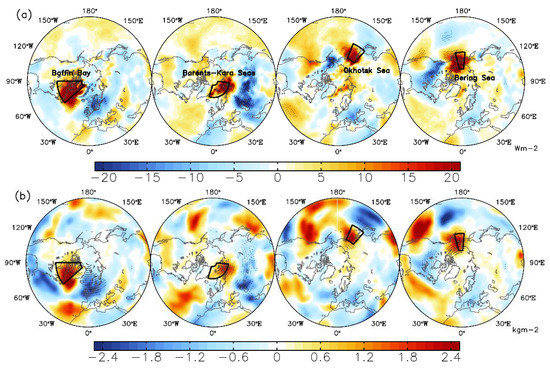 The Arctic amplification has attracted many researchers in recent decades [1,2,3,4] and the direct effect of the Arctic amplification is Arctic warming and the rapid melting of Arctic sea ice in all seasons [5,6]. Although the Arctic sea ice cover (SIC) is the least in late September, the significant decrease in winter sea ice and the more frequent extreme cold weather in mid-latitudes in winter make it necessary to focus on the winter Arctic SIC change and associated processes [7,8,9]. Recently, many studies have addressed the mechanism of SIC change in winter [10,11]. The roles of radiation and sensible heat [8,12], moisture transport [13,14], wind-driven sea ice drifting [15,16] and other factors [17] have been examined in many previous studies.