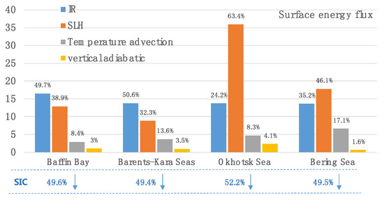 The effects of blocking on sea ice decline and the changes in related radiation variables are discussed above. In this section, it is necessary to quantify the sea ice decline associated with the blocking circulation at weekly time scales. Above all, the contributions of the related variations to the surface energy flux that associated with the blocking should be calculated quantitatively. According to Figure 7, the downward IR, SLH, temperature advection and vertical adiabatic heating/cooling anomaly all make positive contributions to the positive surface energy flux (SAT) but the cloud forcing net solar flux does not. Thus, the regional averaged downward IR, SLH, temperature advection and vertical adiabatic heating/cooling anomaly during lag −5 to lag 5 (life cycle of the blocking) are calculated and each component with respect to the total surface energy flux (sum of the four terms) can be obtained as shown in Figure 9. Note that land regions have been excluded from the regional mean. For regions Baffin Bay and Barents-Kara Seas (Figure 9), the downward IR clearly contributes the most to the surface energy fluxes at 49.7% and 50.6%, respectively. The SLH accounts for the second highest contributions at 38.9% and 32.3%, respectively. The contributions of temperature advection and the vertical adiabatic heating/cooling anomaly are relatively small. However, for regions Okhotsk Sea and Bering Sea (Figure 9), the SLH contributes the most to the surface energy flux at 63.4% and 46.1%, respectively. In addition, the downward IR accounts for the second highest contributions at 24.2% and 35.2%, respectively. These results may due to the more open geographical locations in regions Okhotsk Sea and Bering Sea with more open water; this situation benefits heat exchange between the ocean surface water and the atmosphere. At the same time, the latitudes of regions Okhotsk Sea and Bering Sea are also lower than those of regions Baffin Bay and Barents-Kara Seas and the SIC is lower than those in regions Baffin Bay and Barents-Kara Seas. Therefore, the SLH values generated by ocean-air interactions in regions Okhotsk Sea and Bering Sea are higher than those in regions Baffin Bay and Barents-Kara Seas. However, the warming caused by the downward IR also leads to changes in the SLH. It is difficult to distinguish the change in the SLH induced by change in IR. Due to the complex coupling of the ocean, sea ice and atmosphere system, accurate quantitative estimation may not be obtained and our quantitative calculation here is only an approximation. Moreover, according to previous studies [8,12], the downward IR (positive anomaly) is a direct radiation variation caused by blocking-induced poleward moisture transportation, which can significantly affect the SAT and SIC changes in regional areas.