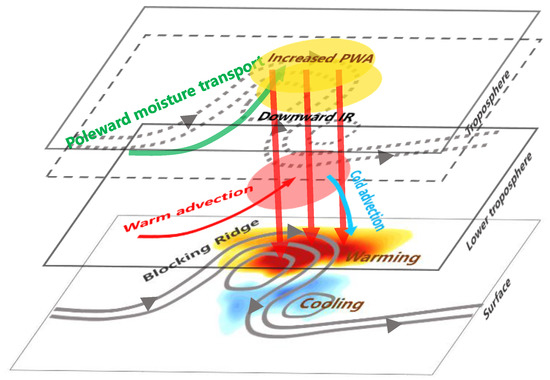 The physical process by which the blocking circulation affects the sea ice decline is outlined in the schematic diagram shown in Figure 10. The blocking circulation is a deep atmospheric system that develops from the surface to the upper level of the troposphere. When the blocking circulation begins to grow and reaches its peak, as shown in Figure 10, the blocking ridge and trough can usually be found in the local region. In the lower troposphere, the air temperature advection (red and blue arrows) associated with the blocking circulation can make certain contributions to warming in the higher latitudes (red shading) and cooling in the lower latitudes and downstream (blue shading) at the surface. More important, the poleward moisture transport (green arrow) that is controlled by the blocking circulation makes water vapor gather in the higher latitudes (orange shading) through the entire troposphere (mainly in the lower troposphere). The positive water vapor produces positive downward IR at the surface and significantly affects the SAT changes at higher latitudes. The increased SAT may promote the melting of the sea ice in the local region. However, because sea ice melting is a slow process, the decline in sea ice may lag the blocking variation by 3~6 days and lower levels may persist for weeks after the end of blocking. Owing to the blockage by the blocking ridge, moisture transport from the west to the east at mid-latitudes is effectively suppressed. Thus, due to the negative downward IR and cold temperature advection, the SAT in the mid-latitudes downstream from the blocking ridge can be significantly decreased (blue shading).