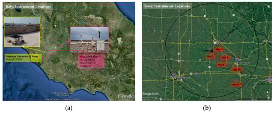 Locations of the disdrometers used in this study in Italy (a) and in Iowa (b).