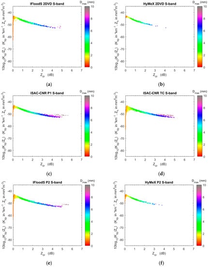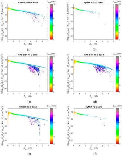As for Figure 2, but for C-band. (a) IFloodS 2DVD dataset; (b) HyMeX 2DVD dataset; (c) ISAC-CNR P1 dataset; (d) ISAC-CNR TC sataset; (e) IFloodS P2 dataset; (f) HyMeX P2 dataset.