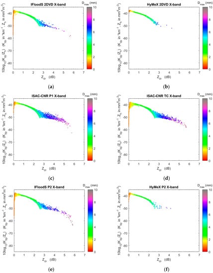 As for Figure 2, but for X-band. (a) IFloodS 2DVD dataset; (b) HyMeX 2DVD dataset; (c) ISAC-CNR P1 dataset; (d) ISAC-CNR TC sataset; (e) IFloodS P2 dataset; (f) HyMeX P2 dataset.