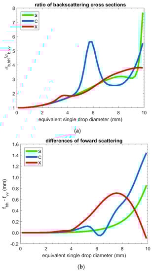 Ratio between backscattering cross section (a) and differences between forward scattering amplitudes (b) at horizontal and vertical polarization as function of equivalent drop diameter for S-band (green line), C-band (blue line) and X-band (red line).