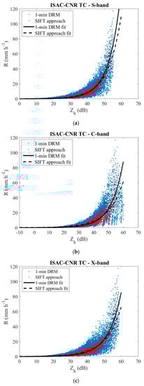 Scatterplot of Z versus R as obtained from Thies Clima DSDs for the different frequencies considered in this study. Blue dots are for 1-min DRM and red dots are for the SIFT approach. The black lines represent the Z-R relation obtained from 1-min DRM and applying SIFT. (a) S-band; (b) C-band; (c) X-band.